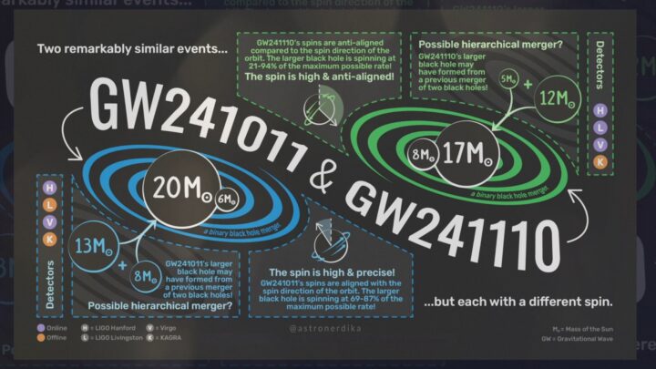 The pair of gravitational-wave events, named GW241011 and GW241110, were detected in late 2024, just one month apart, during the O4b observing run of the global detector network. Each signal was produced by the violent merger of two black holes, forming an even more massive remnant and sending ripples through space-time, each travelling for hundreds of millions to billions of years before reaching Earth.