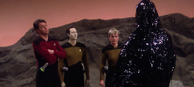 The episode where the dynamic of the senior officers changes… aside from some terrible makeup that (I think) is supposed to be blood, this episode struck a chord. Granted it’s only been a week since I started the series, but Tasha grew on me… and it’s sad to see her go. The memorial scene was a very nice touch… gave me goosebumps.